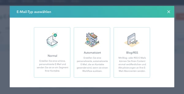 Über den Menüpunkt 'Marketing – E-Mail' gelangen Sie zum E-Mail-Tool von HubSpot; ein Klick auf 'E-Mail erstellen' bringt Sie zu einem Auswahlfenster, in dem Sie sich für einen Mail-Typ entscheiden: