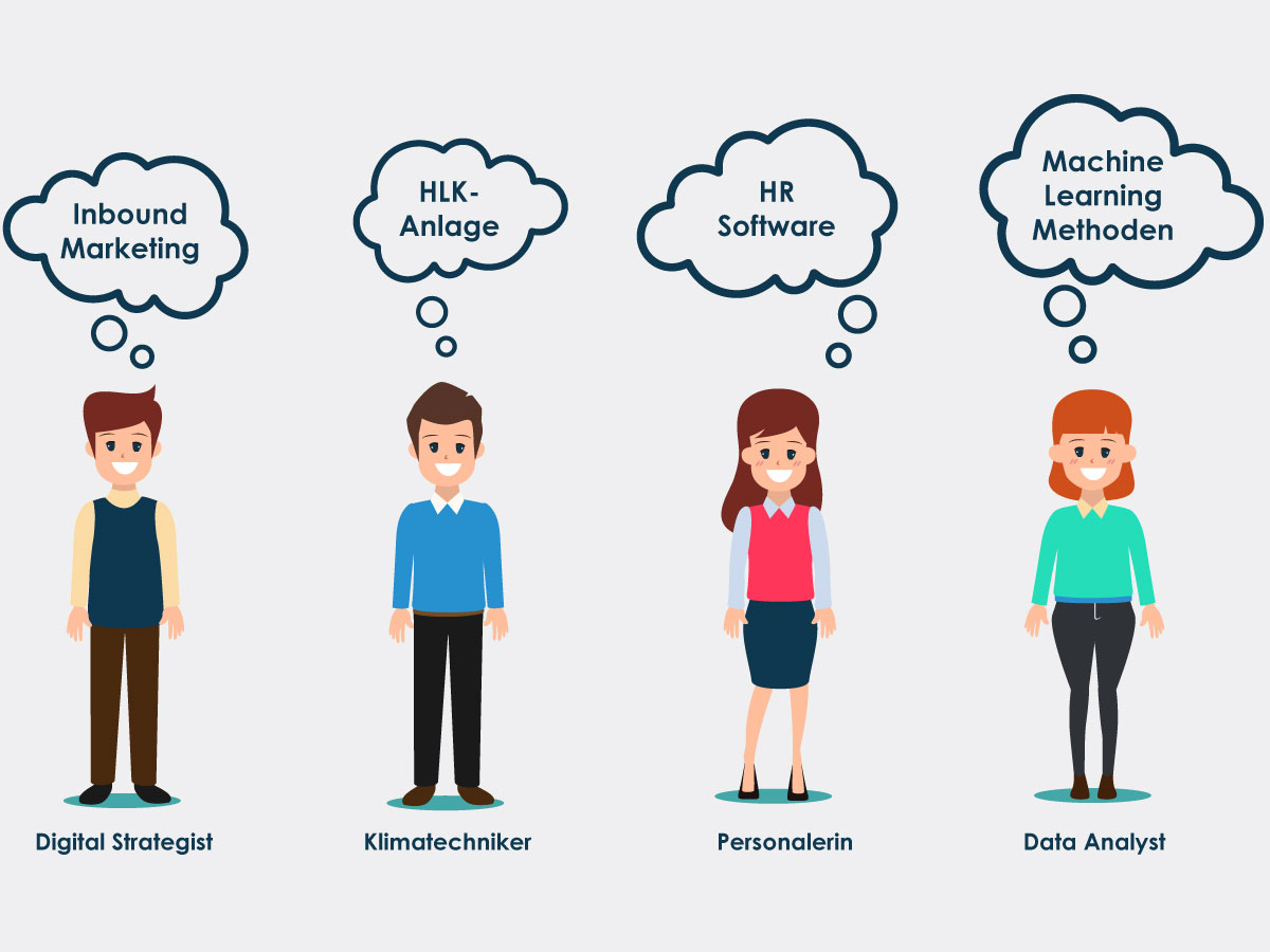 Wenn diese Entscheidungsträger über eine Anschaffung diskutieren, meinen sie im Zweifelsfall denselben Gegenstand - sie suchen aber über ganz unterschiedliche Begriffe danach. Das bedeutet: Ihre Seite muss für verschiedene Fragen optimiert sein. Nehmen wir als Beispiel den Begriff "HLK-Anlage". Je nachdem, wie Sie Ihre Personas definieren, können Fragen so aufgebaut sein: