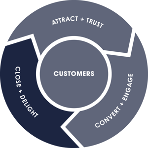Das Flywheel ist der Grundpfeiler der Inbound-Methodik, bei der Kund:innen im Mittelpunkt stehen. Es gibt die Bereiche Attract, Engage und Delight, die die Reise des Kunden darstellen. Potenzielle Kund:innen werden durch Marketingmaßnahmen auf das Unternehmen aufmerksam (Attract) und konvertieren dann zum Lead (Engage) durch Formulareinsendungen. Die Generierung der Leads erfolgt in der zweiten Phase (Convert + Engage), wo die Aufgabe des Marketings und des Vertriebs darin besteht, die Leads zu qualifizieren und anzureichern.